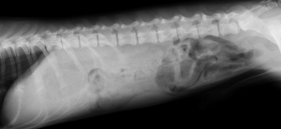 犬が消化吸収できない異物を誤食してしまった場合、異物が消化管で詰まってしまうと液体やガスも通過できないような状態に陥り(完全閉塞)、嘔吐・食欲廃絶などの臨床症状が激しく出現します。