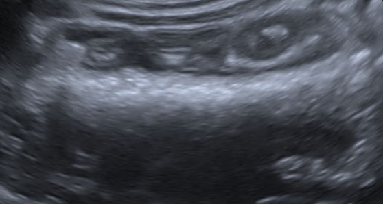 超音波検査 アコーディオン状に引き攣れた消化管と中に太めの紐状異物を確認