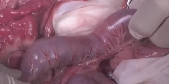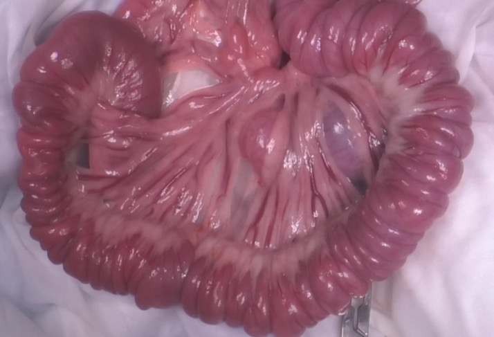 開腹すると広範囲にアコーディオン状になった消化管が認められ、一部が腸重積を起こしていました。アコーディオン状に引き攣れた消化管